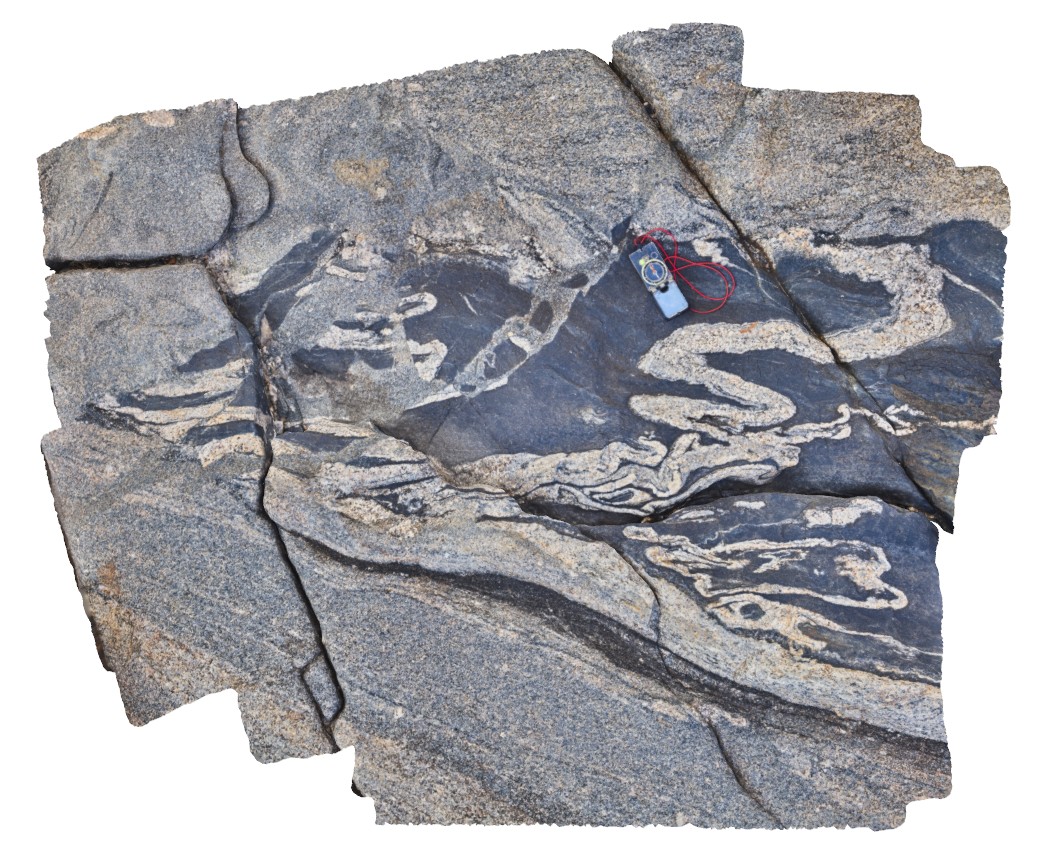 | Description: | Granitic gneiss interlayered with metagabbro with tightly folded leucosomes. Cut by late granodiorite. |