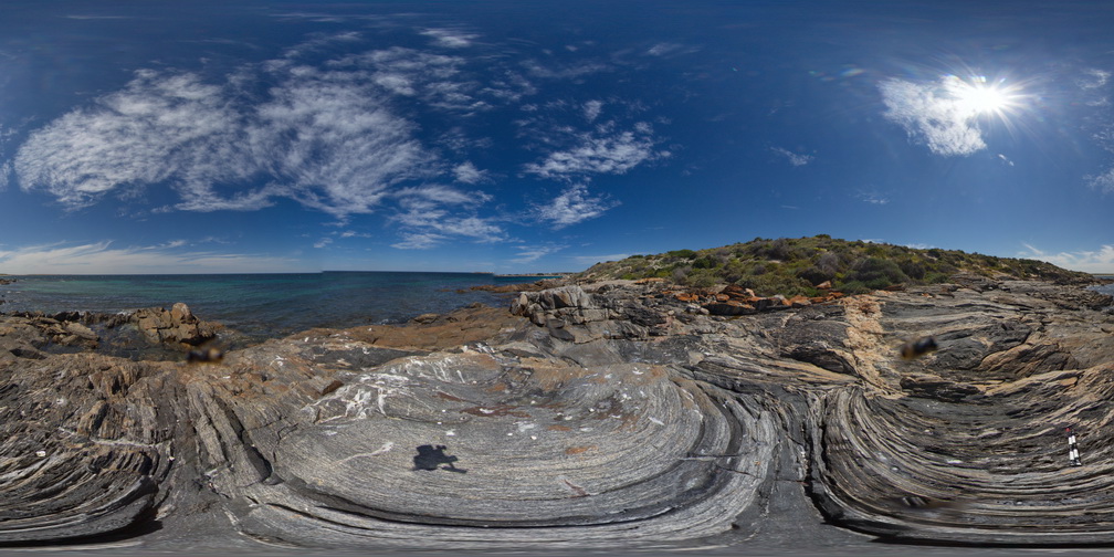 | Description: | finely banded granitic and mafic mylonite. Intruded locally by pegmatitic dykes. |